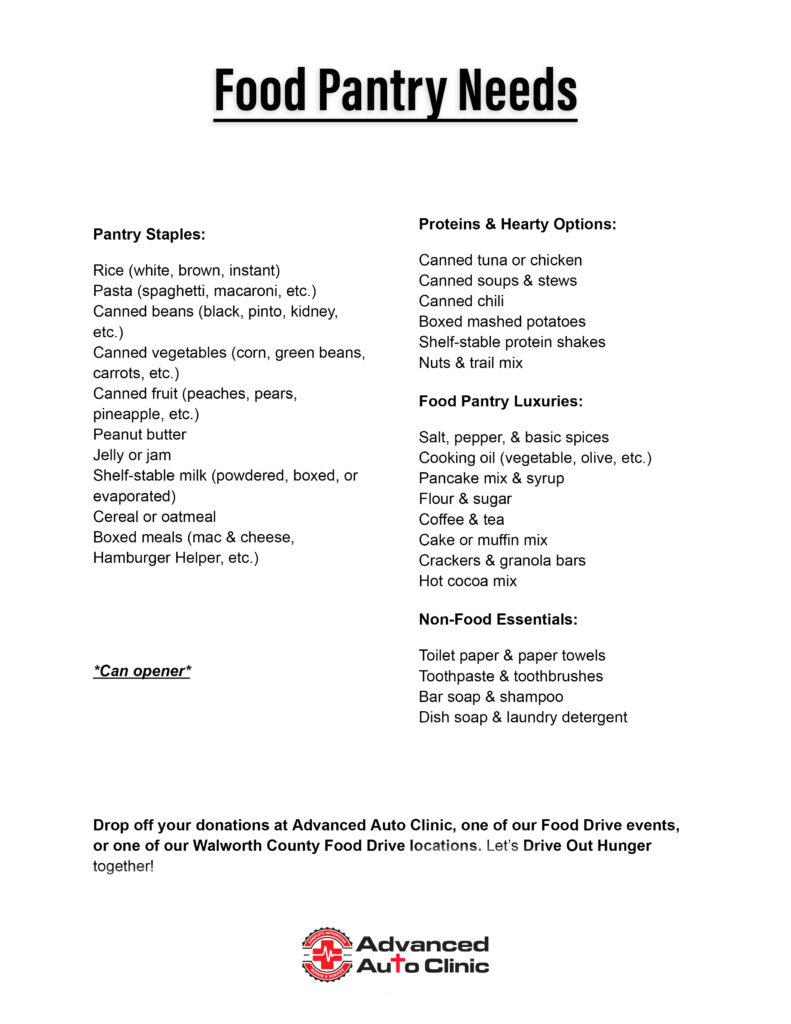 Join Advanced Auto Clinic in making a difference right here in Walworth County. Every non-perishable food item you donate not only helps feed local families in need but also earns you $2 off your next auto service (up to $20 in savings). From canned goods to essential supplies, your donations directly support our community food banks when they need it most.
